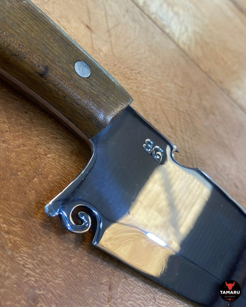 Seu cabo é confeccionado em Madeira com um design que garante elegância e uma pegada confortável, que facilita o manejo e proporciona segurança durante o corte. Além disso, a combinação do aço inox com Madeira que confere à faca um visual rústico e autêntico, que remete às tradições campeiras e ao espírito do churrasco gaúcho.