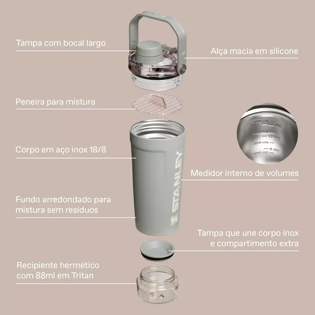 O Activate Shaker é uma inovação que acompanha as principais tendências de wellness. Proporcionando mais praticidade no momento da suplementação pré, durante e pós-treino, ele permite o transporte seguro dos suplementos antes e depois do preparo, com um recipiente em Trítan ideal para armazenamento de ingredientes secos. Na parte interna, uma peneira acoplada à tampa facilita a mistura, enquanto o corpo em aço inox 18/8 garante a temperatura ideal do início ao fim do exercício.
